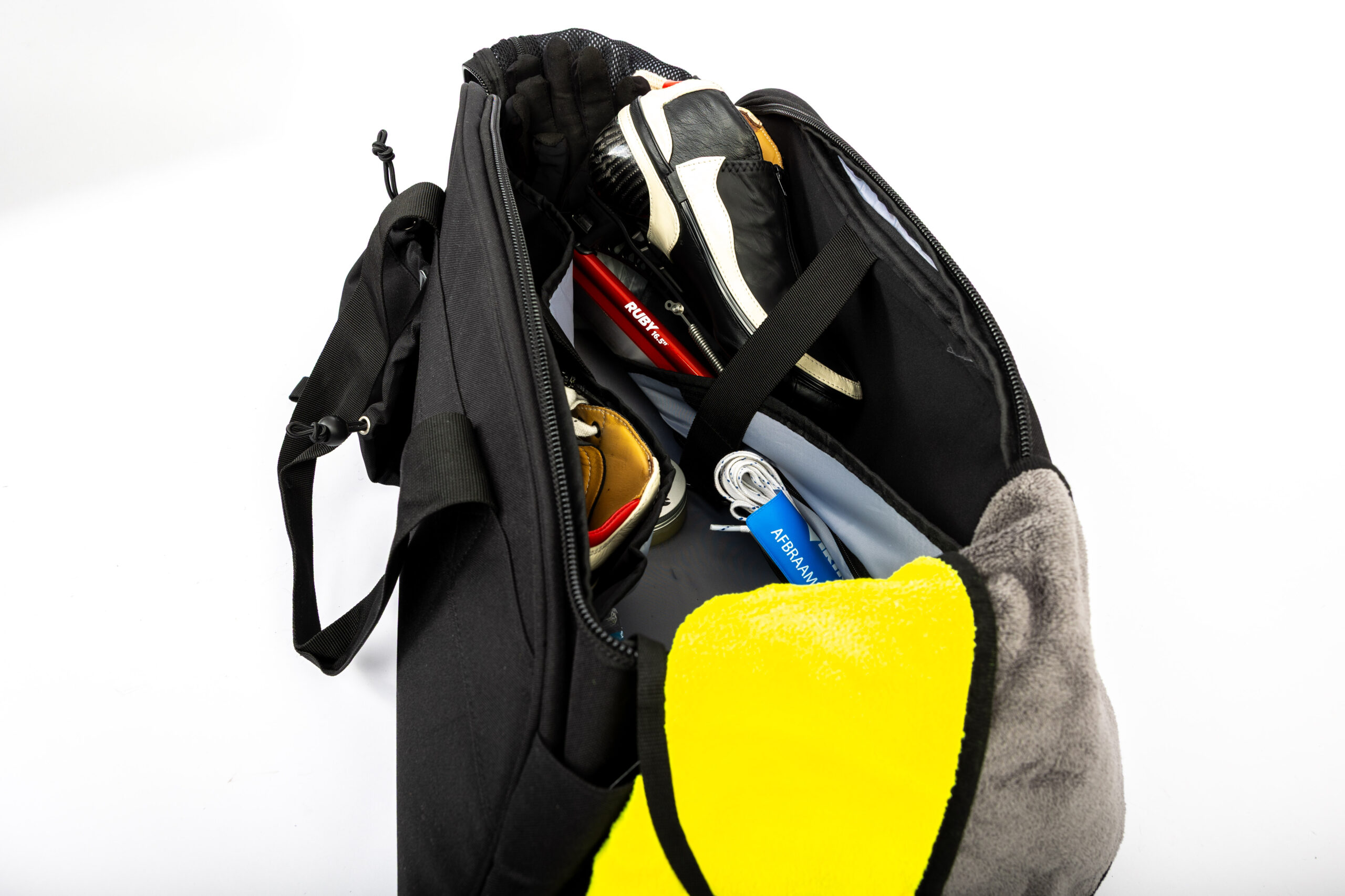 De schaatsen nu ook veilig en netjes bewaard binnen in de tas, middels de snijvaste schaatsvakken aan weerszijden. Nooit meer een droogdoek die kwijt of vergeten is, door het speciale opbergvak waaraan deze bevestigd zit met een simpel clipje. Daarbij is óók deze tas voorzien van solide handgrepen en hengsels voor de backpack-modus; zo is de tas altijd prettig te dragen.